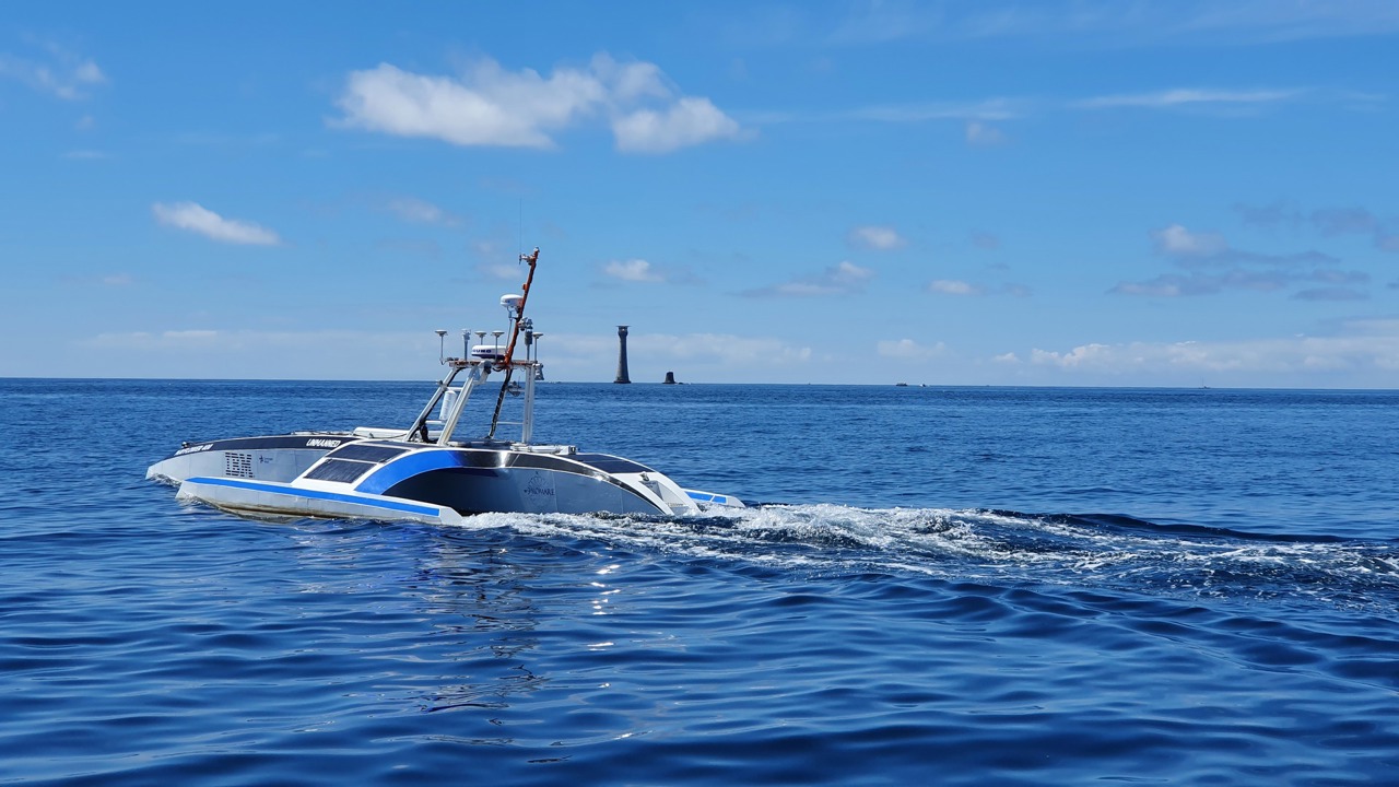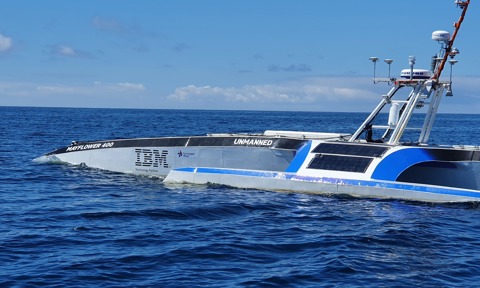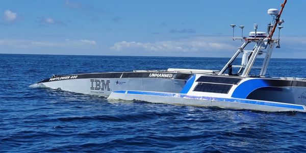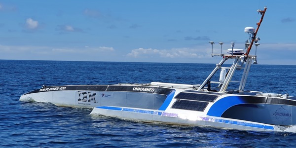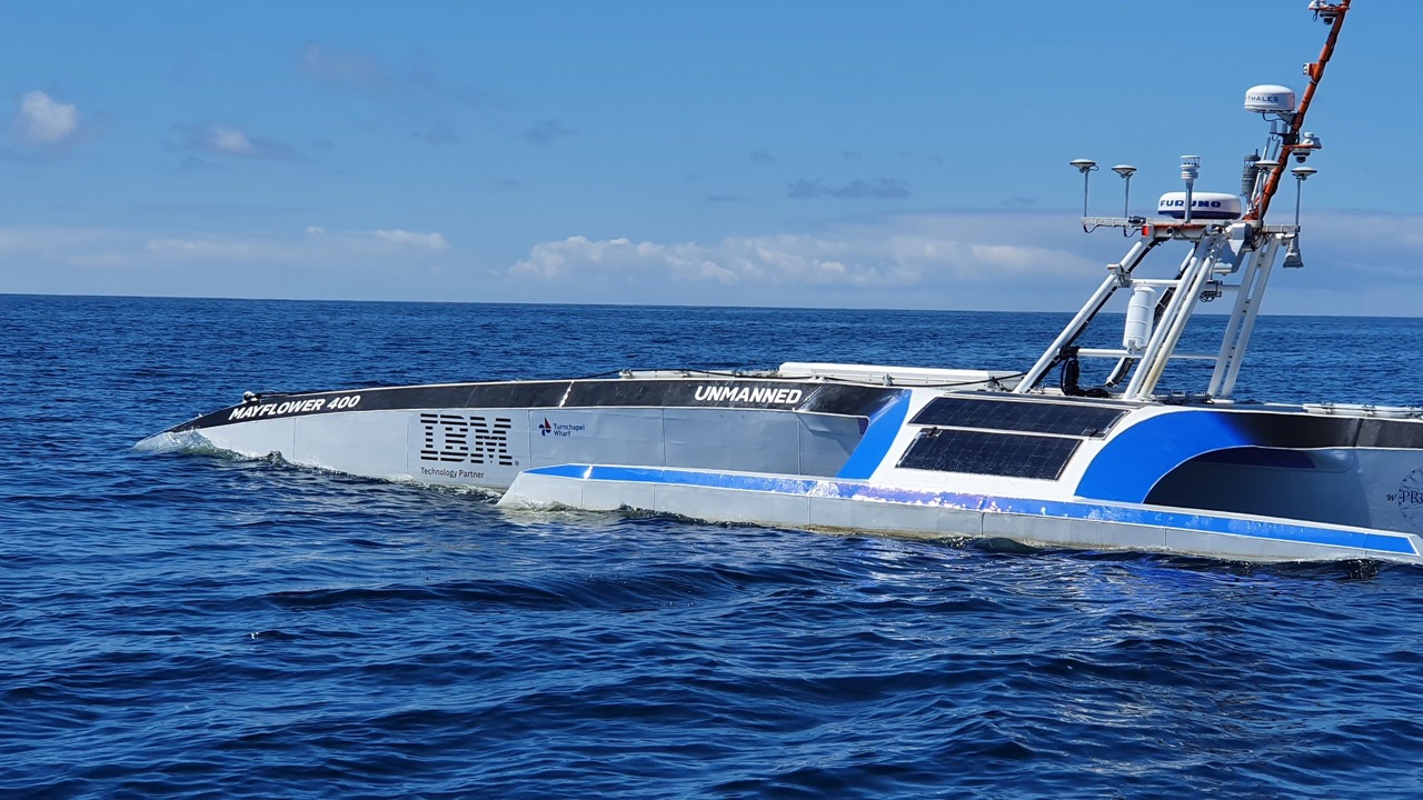 Powered by solar energy and an 'AI Captain', the ship's computer performs a similar role to a human captain allowing the vessel to cross the Atlantic fully autonomously. Assimilating data from a number of sources, it constantly assesses its route, status and mission, and makes decisions about what to do next. Cameras and computer vision systems scan the horizon for hazards, and streams of meteorological data reveal potentially dangerous storms. Machine learning and automation software ensure that decisions are safe and in-line with collision regulations.
