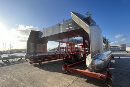 The production vessel appears to closely match the model shown at DSEI in 2023 and the CGI renders issued at the time of the contract announcement. The standard Main Payload Space (MPS) in the centre has a 2m x 2m x 2m capacity and there are small Secondary payload spaces in the upper fore-end and lower aft end, likely to be occupied by sensors. The MPS has doors top and bottom that allow items to be loaded in from above and to exit from the underside of the craft when deployed underwater. Examples of potential payloads could include an ROV deployed on an umbilical from the mission bay and an Autonomous Underwater Ground Vehicle (AUGV) lowered to transit across the seabed.